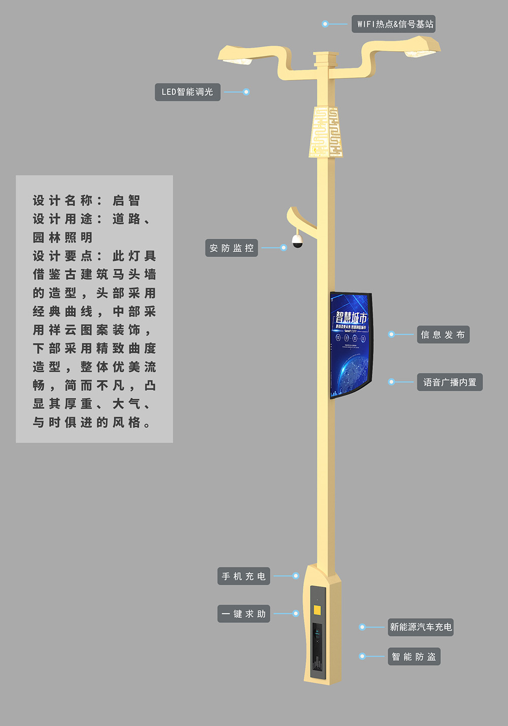 設(shè)計要點(diǎn):此燈具借鑒古建筑馬頭墻的造型,頭部采用經(jīng)典曲線,中部采用祥云圖案裝飾,下部采用精致曲度造型,整體優(yōu)美流暢,簡而不凡,凸顯其厚重、大氣、與時俱進(jìn)的風(fēng)格。